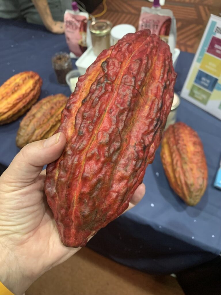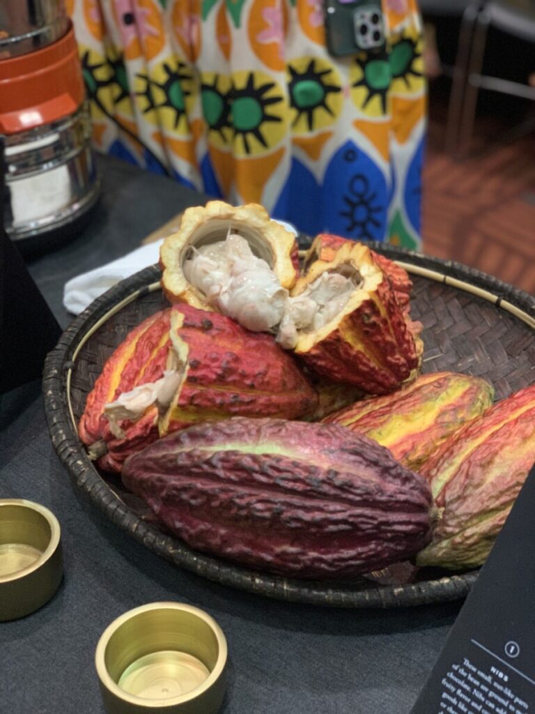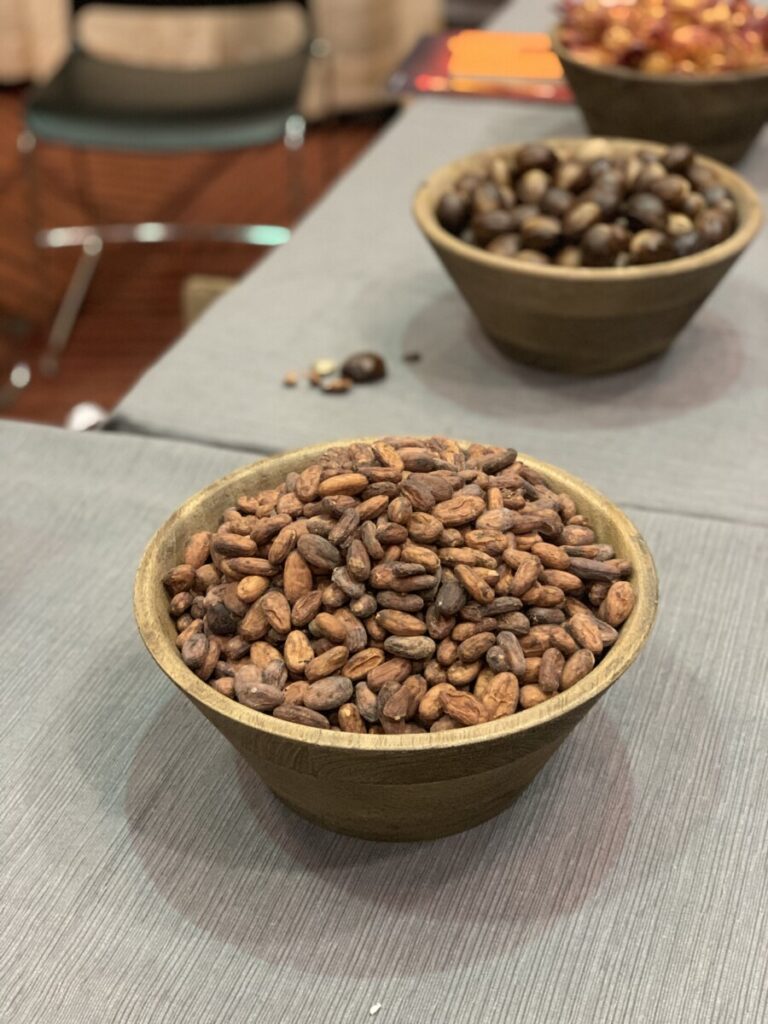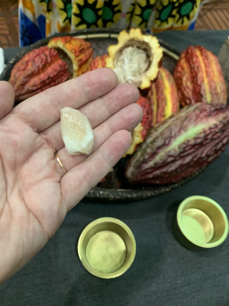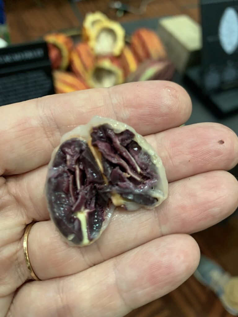 This was super exciting! There was fresh cacao and we were able to try a pod with the pith and the pit. The white pith was slimy, custard texture. It tasted like tutti fruti, mangostein, sweet tart and I loved it. I cracked open the seed and it was a beautiful purple color and bitter.