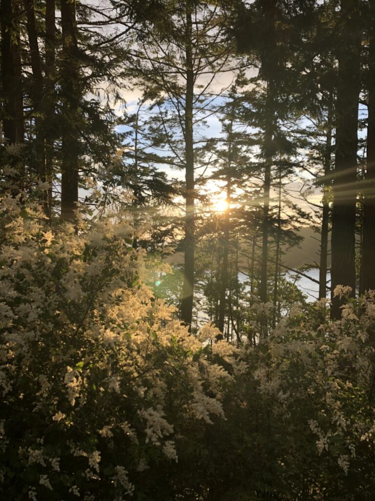 I wondered as I made my way to what I now refer to as my spot. Feeling the slug of my boots in the mud and water, cool in the deeper parts. They crystal cold rolling over smooth stones in the center speaking of its journey. Tender trees and bushes heavy with dew drops hung in an ark over the creek. Towering alder and big leaf maple rustling in the wind. As I took it all in, the morning sun, low in the east, broke through the fog and beamed through the dew drops, millions and millions of them, smashing white light to reveal the colors within spraying light and rainbow on every surface. I stopped in my tracks, this was magic, for sure magic. I at once was deeply aware of all my senses. My feet cool as the water rolled over my boots. Shoulders and wild hair damp from collecting dew drops, miniature moss forests on the edge of the mud banks bright in the sunshine. A tunnel of rainbow lit limbs arching over the creek, dark at the end. The fresh wet smell of earth and sun and magic was delicious. I am sure the woodland creatures were dancing there with me. Time stopped and my senses were alive. I was reassured that this was my spot and now knew why I was always at peace there. I held it in high esteem and respect, and it was thanking me and letting me see it’s secrets. I was honored.