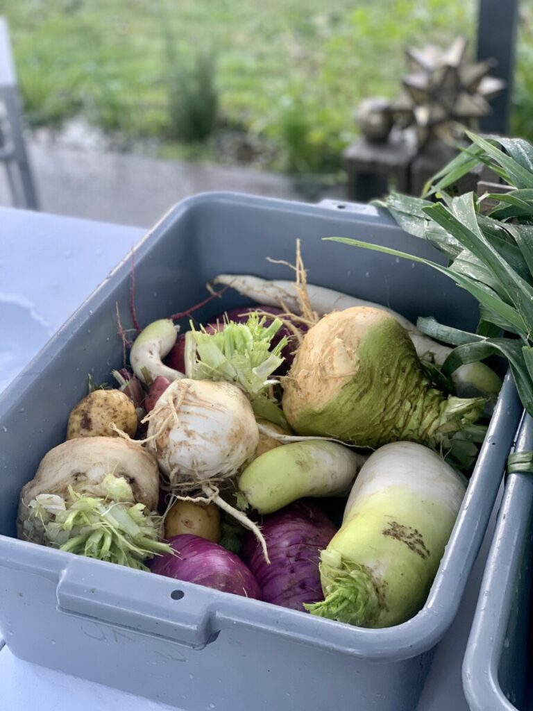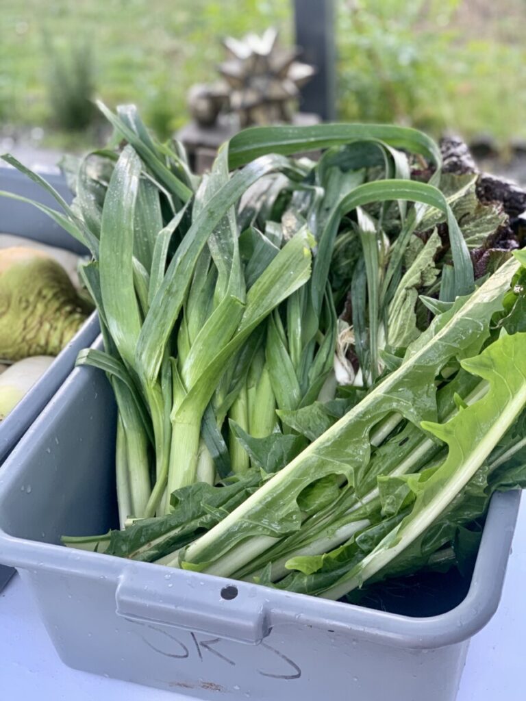 Through this class and Ezra’s research triangle we were able to gather some of the excess produce. I picked a gigantic rutabaga wondering what on earth I would do with it! I picked herbs, radishes, kale and dandelion and so many leeks.   I cut open the rutabaga and smelled it and instantly thought of my grandmother’s soup, so I decided to combine nostalgia and the practice of cooking with what you have and made soup.  It turned out so close to my grandmother’s potato soup I think she would be proud of my ingenuity, not wasting a bit and remembering to add plenty of the secret ingredient.