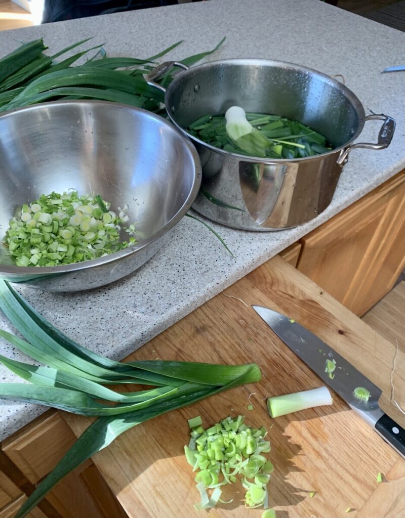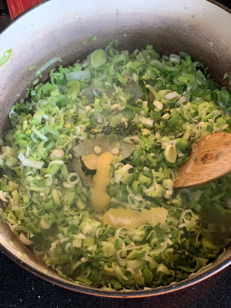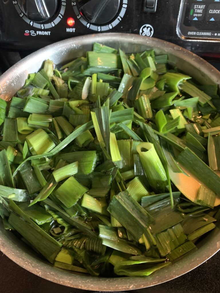 3lbs Leeks – white and light green parts chopped (cut the dark green parts, cover with water and simmer for broth)