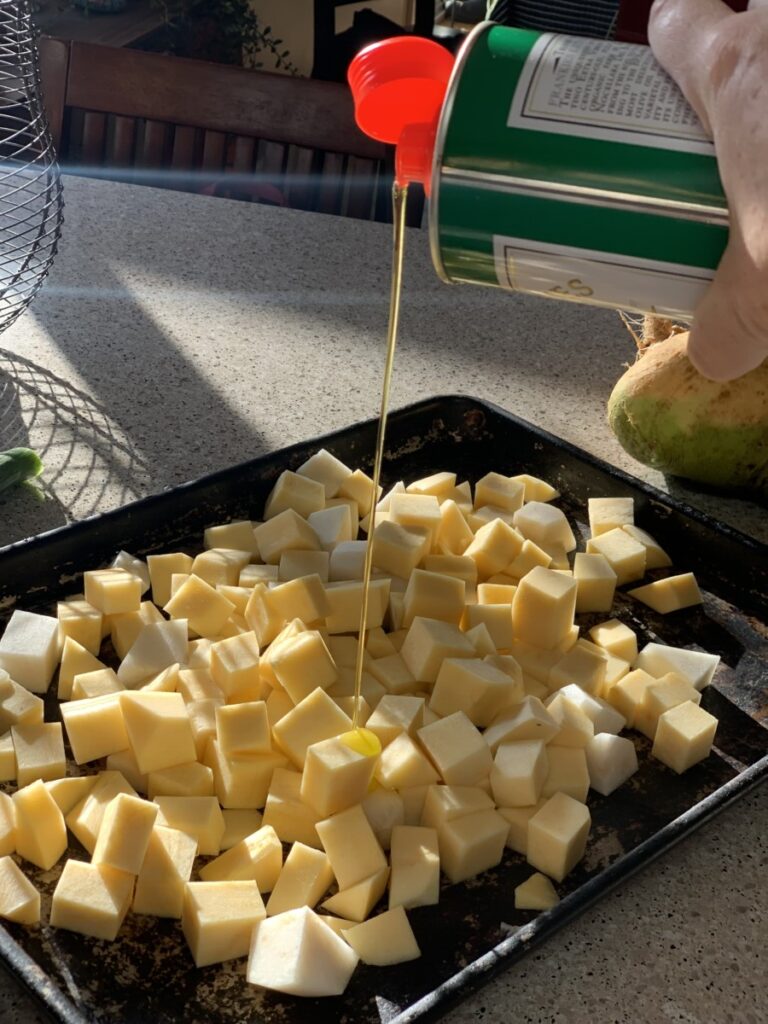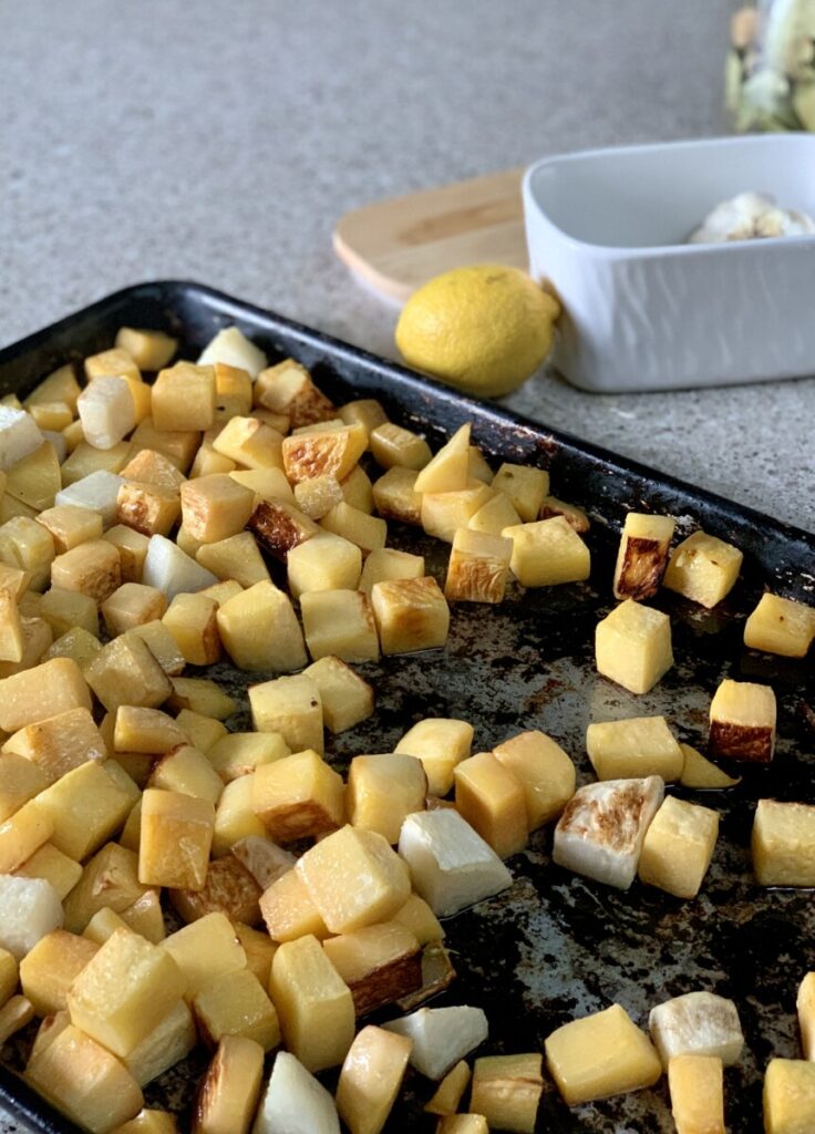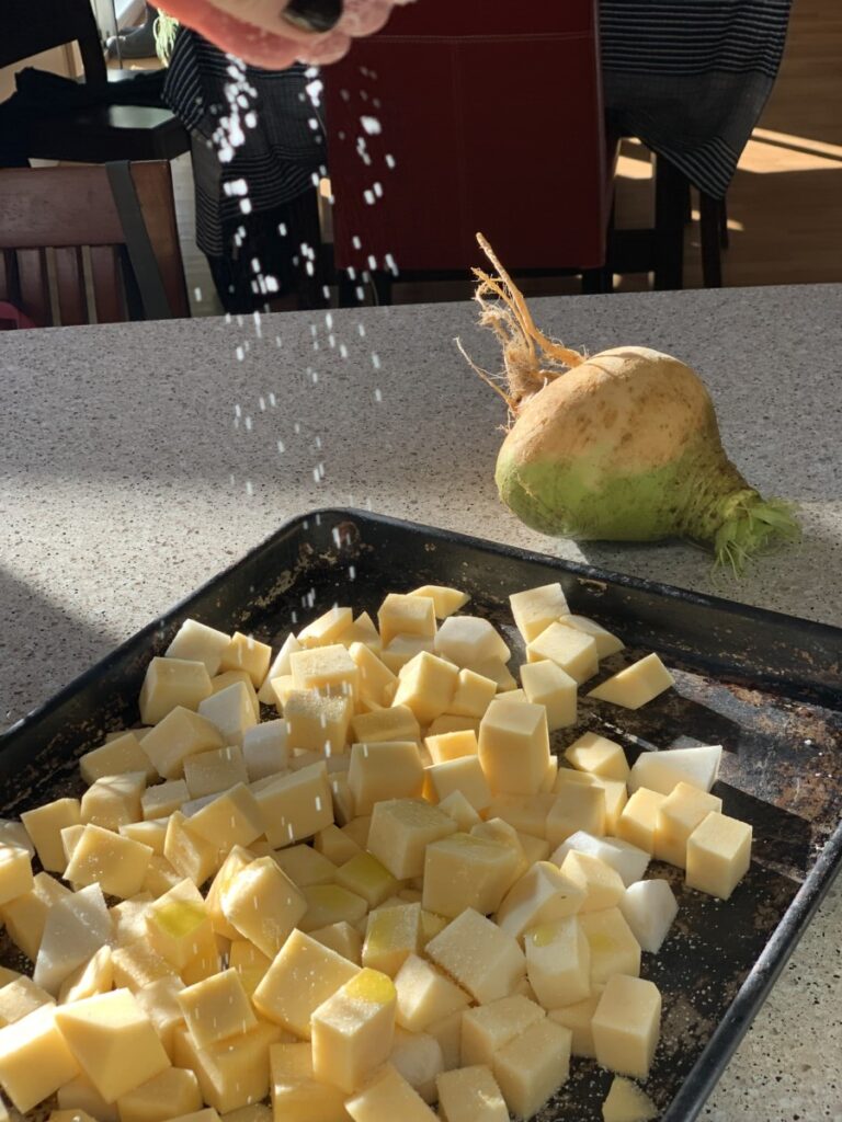 1. Toss potatoes (or rutabaga) in olive oil and salt, roast in a 400-degree oven until lightly browned.