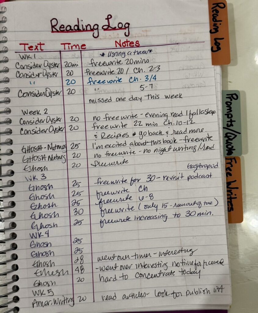 I began a log to read and write daily. This allowed me to read some of the books I have had on my reading list for a long time which was wonderful. I spent time free writing after each of my reading days and week by week I increased the amount of time I read and wrote.