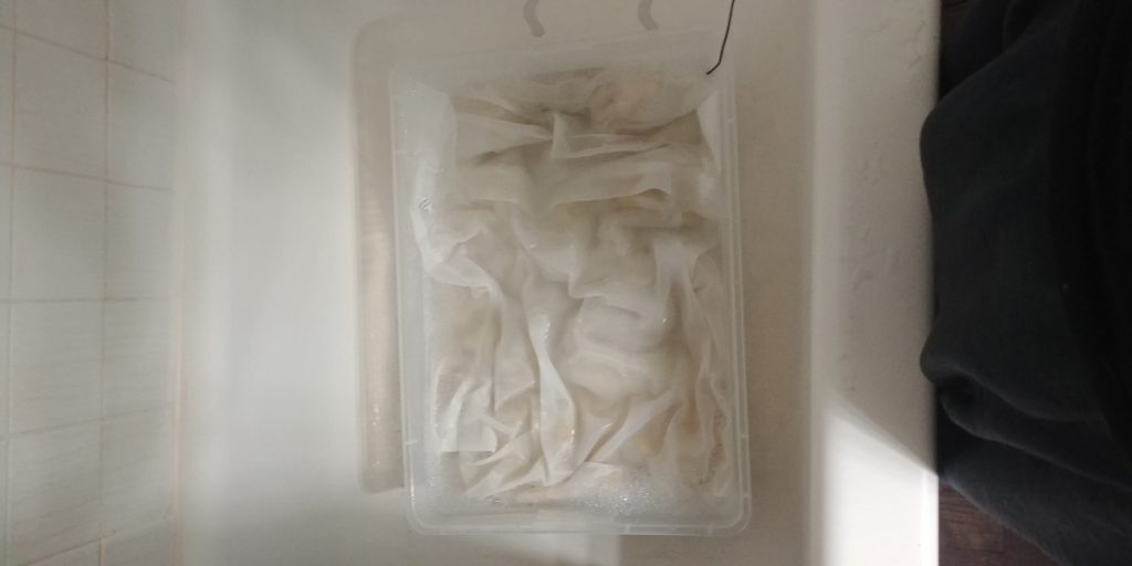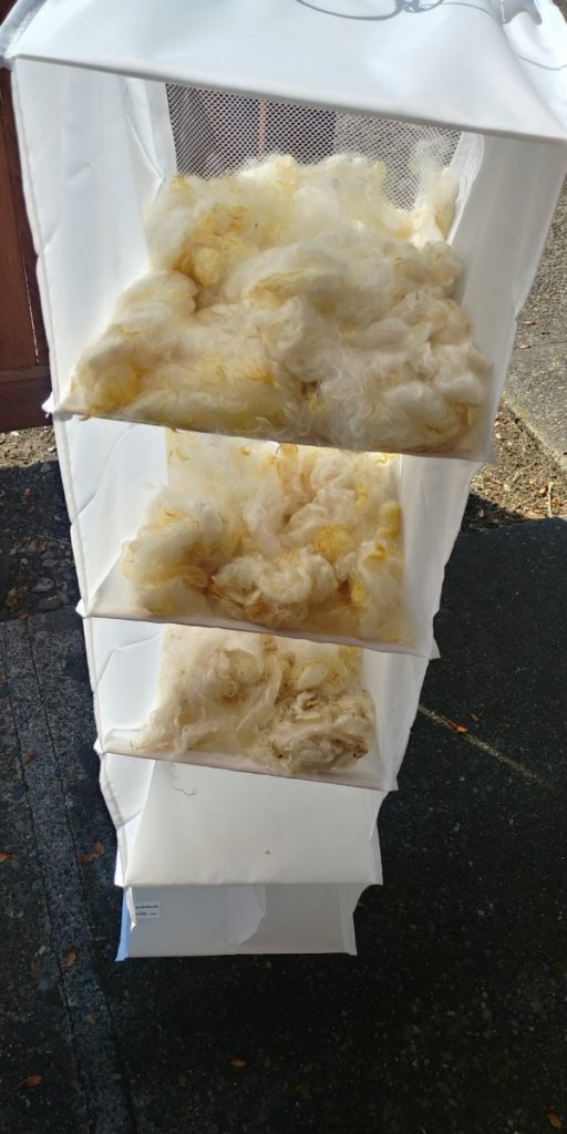 First, I filled my plastic tub with hot water and some Dawn detergent. I then placed the mesh bag full of wool into the tub carefully and let it sit for about 20-30 minutes. I covered the tub with a lid and shut my bathroom door in an attempt to keep the water from cooling too much; I’m not sure if it worked as my thermometer, it turned out, was defective. While the wool was sitting, I boiled more water for the next step, which was to take out the wool, empty the soapy water out of the tub, and replace it with more hot water but no soap. Again, I let it soak for 20-30 minutes. Afterwards, I emptied the tub once again and did my best to squeeze out the excess water from the wool without actually wringing it, which would result in felting. I took the wool outside and let it dry in a vertical storage thing made of fine mesh that you would hang in a closet. I wanted something that would let air circulate. I also placed wool on the table outside. Every half hour or so I would move the wool around so the dampest parts would be exposed to air and sun. Ideally I would have had some sort of setup where the wool could sit on mesh and and be allowed dry without my help.