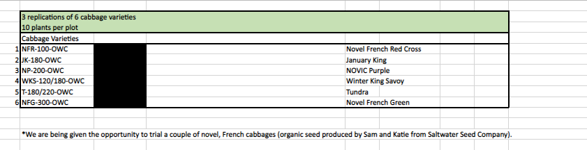 The varieties of cabbage that match my goals are from a variety of sources and represent the work of OSA, Saltwater Seeds, Uprising Organics, Adaptive Seeds, and Territorial Seed Company. From Territorial Seed Co. I chose ‘Tundra’, I selected ‘January King’ from Uprising Organics, and from Adaptive Seed I chose ‘Winter King Savoy’. From Sam and Katie at Saltwater Seed Co., I acquired seed for two novel French cabbages and will be the first farmer to test these varieties in the United States; until I am given a variety name, I am referring to these varieties as ‘French Green’ and ‘French Purple’. From OSA, I have requested that Laurie McKenzie make a personal selection of the final variety for my trial, and the variety name is yet unknown.