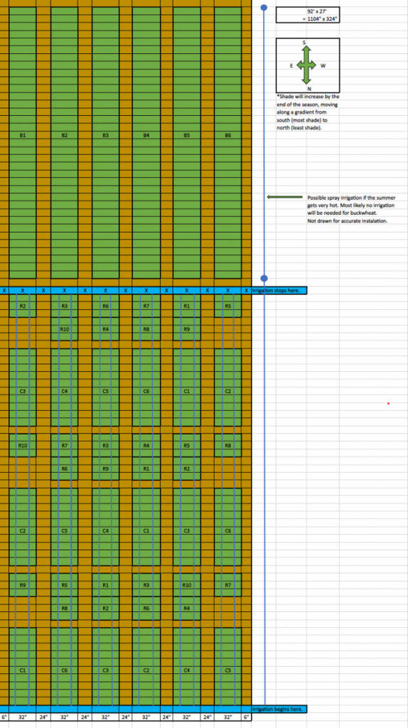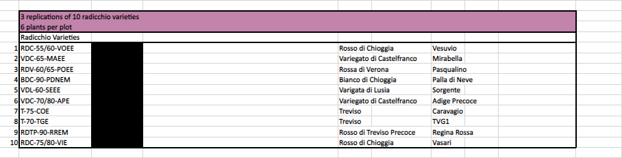 Three replications of each block of varieties were planted in a design that was made to utilize both a north/south gradient and an east/west gradient. The east/west gradient helps to account for soil variability, wind, and weed pressure, and the north/south gradient accounted for a variation in shade across the field. Variety plots in each replication were randomized to provide the best range of possible variation in environments. Cabbage blocks each contain six variety plots of ten plants each. Rows in each plot were spaced 18” apart in an offset or “chicken foot” pattern. Radicchio blocks each contain 10 variety plots of six plants each. Rows were spaced 18” apart, and plants were spaced 12” apart in-row. These blocks were then each replicated three times each. Irrigation was then be laid appropriately, with two drip lines laid in each bed in line with the rows.