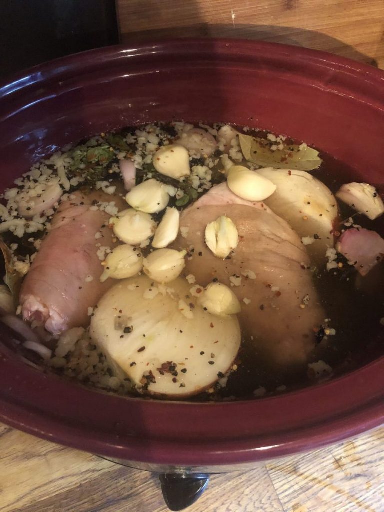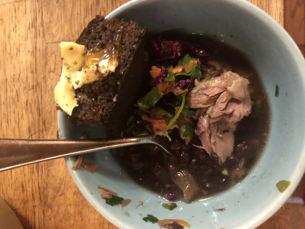 This was one of the most delicious meals we made. The hocks totally fell apart, the skin was amazing, the flavor was perfect, and the cornbread with honey tasted like heaven. It was the easiest meal to make and the most delicious. We topped it with a light coleslaw that had red cabbage, carrots, parsley (we didn’t have cilantro), ginger, and lemon. I didnt get a picture before we got into it. I forgot and it was too good.