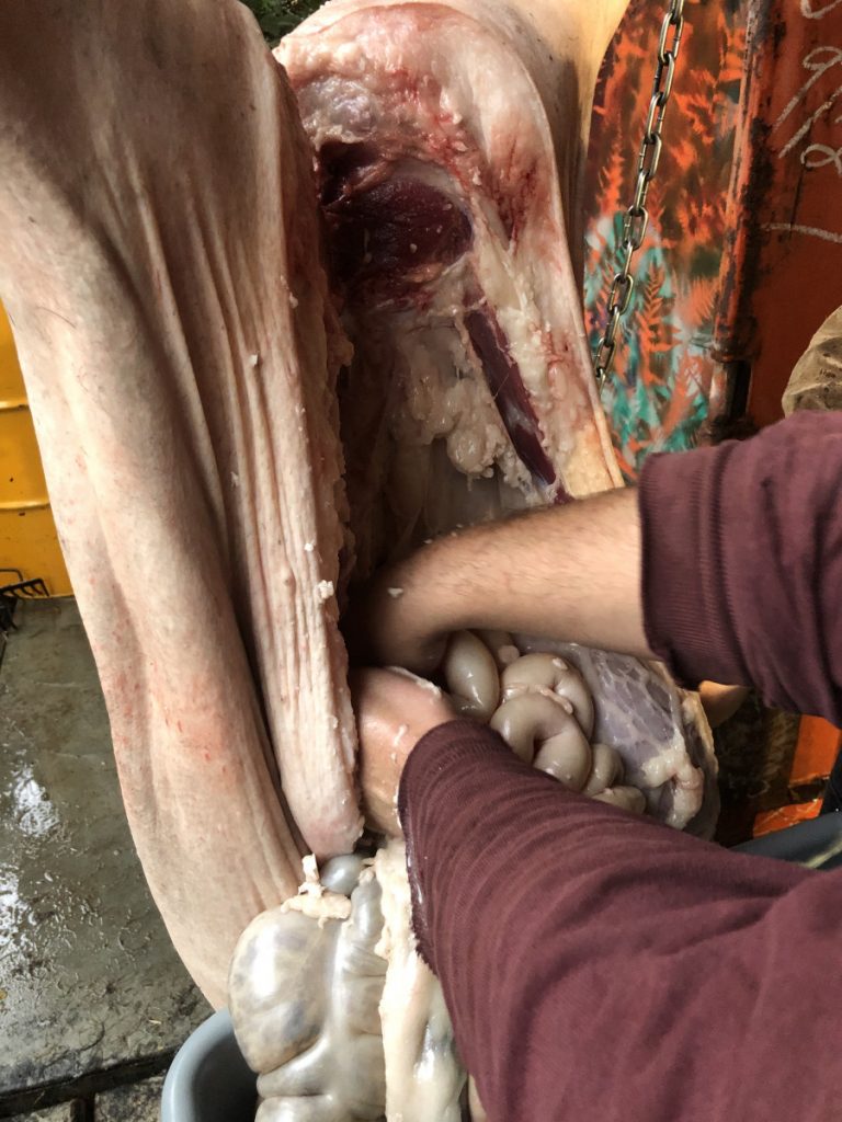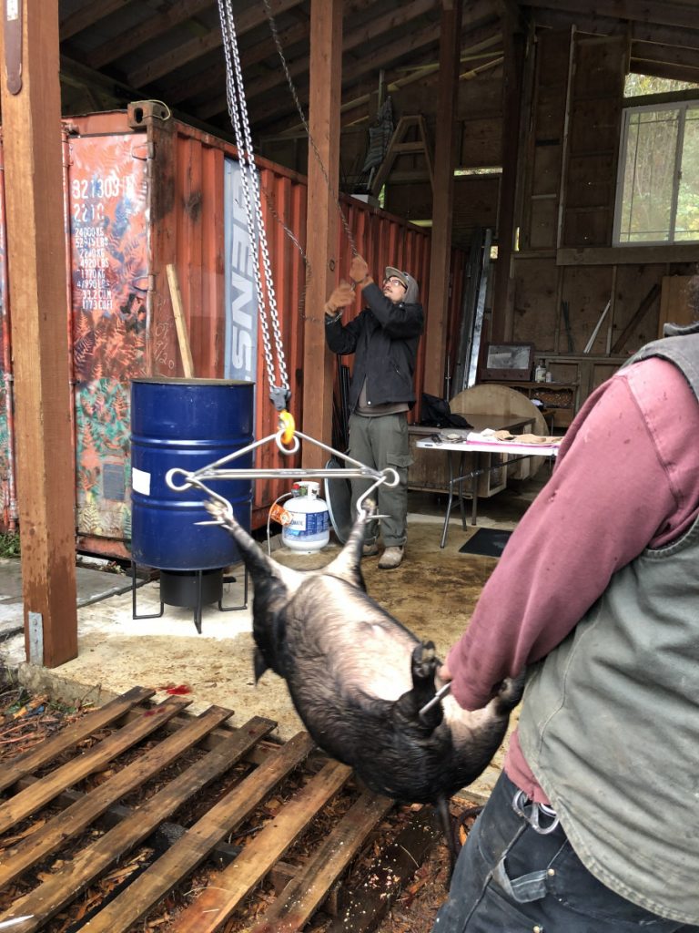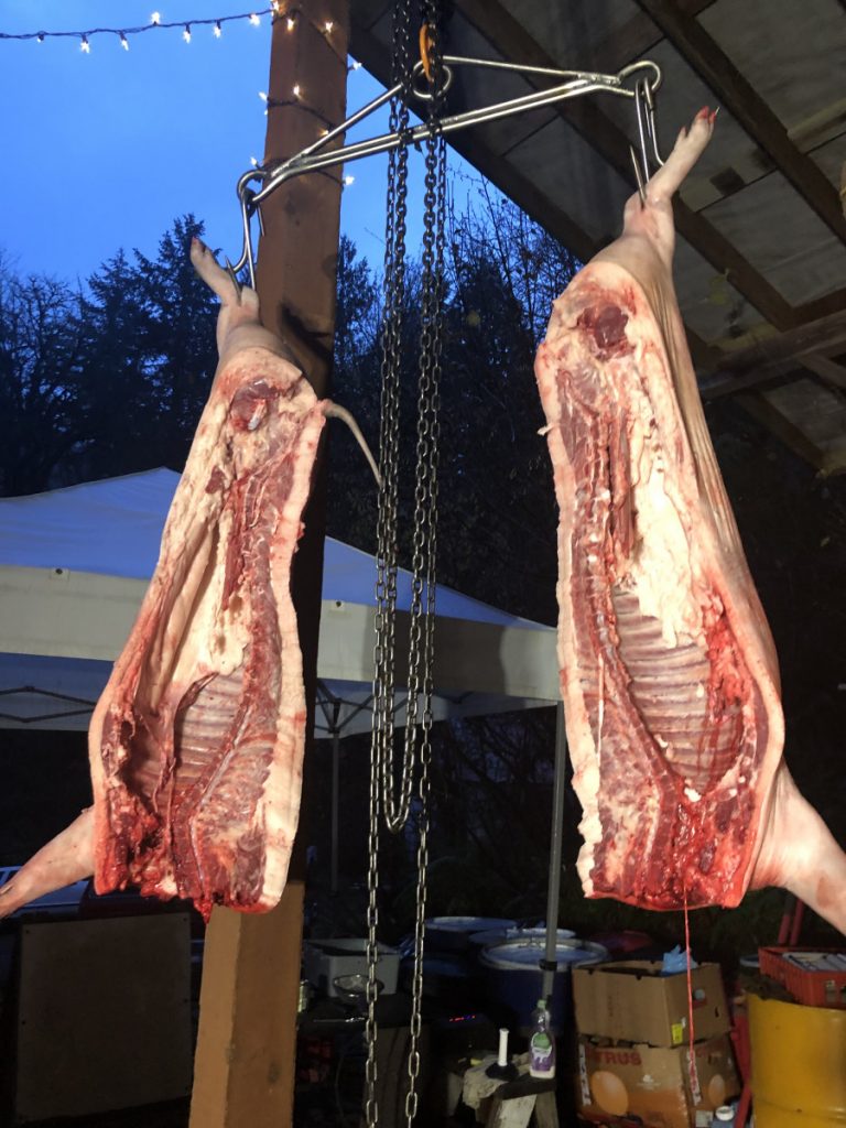 Getting pigs, pasture, foraging, food waste, selective feeding, finishing on pumpkins, the honorable harvest, slaughter day fry, nose-to-tail butchery, pig head pozole, brined thanksgiving ham, pork chops, blood sausage, cider brine, bacon, blood cookies, ham hocks and beans w/ blood corn bread, slaughter #2, italian sausage, italian blood sausage, head cheese, intestine cleaning, books.
